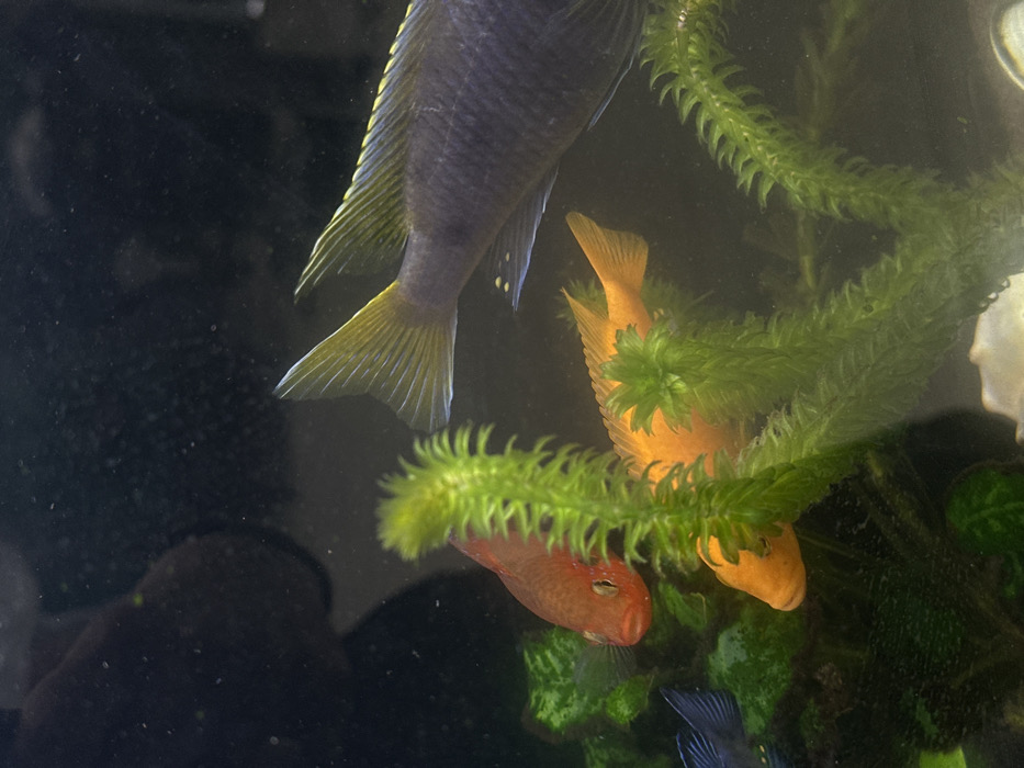 A close-up aquarium shot reveals three cichlid fish. One is larger and dark blue/purple with a yellow tail. Two smaller orange cichlids are nestled amongst green aquatic plants. One of the orange fish is more red in color and appears to be laying down at the bottom of the image. There also appears to be a small blue fish at the bottom.