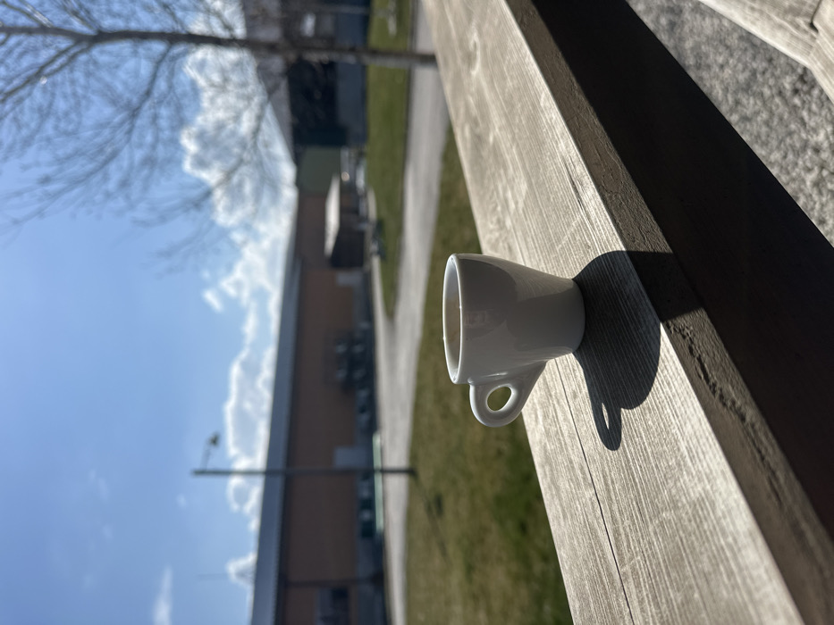 A small white ceramic espresso cup containing a dark liquid is positioned on a weathered wooden railing in the foreground
