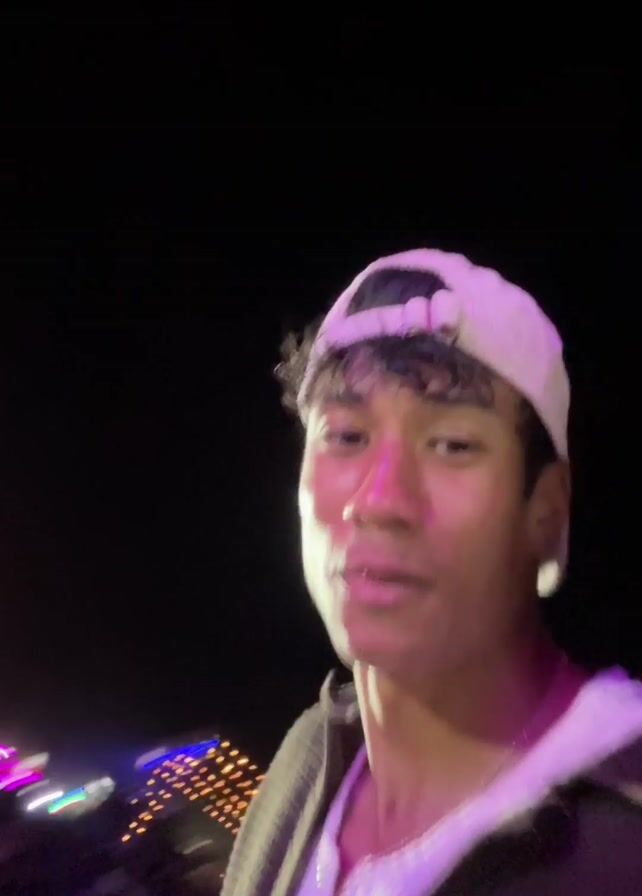 A low-angle selfie video shows a young man on a carnival ride at night. He is wearing a white baseball cap, a grey sweater, and a white t-shirt. To his left, a young woman with long blonde hair is visible, riding in the same seat. They appear to be enjoying the ride, which is brightly lit with various colors. As the ride starts, the camera captures the carnival environment, showing other rides and lights in the background, including one ride labeled “Tornado.” The camera focuses primarily on the young man’s face as he reacts to the ride, looking sometimes at the camera and sometimes around at the environment.