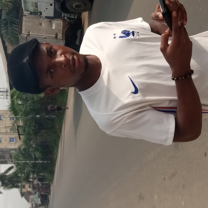 This image depicts a street scene in Umuode, Nigeria, under diffused daylight. In the foreground, positioned right of center, a young adult male with dark skin and short facial hair looks directly at the camera. He wears a black flat cap and a white short-sleeved t-shirt. The t-shirt features a blue Nike swoosh logo on the right chest and a French Football Federation (FFF) rooster emblem with two stars on the left chest, along with red, white, and blue vertical stripes visible on its left side. He holds a black smartphone horizontally with both hands, thumbs positioned over the screen, and wears a dark beaded bracelet on his left wrist. The background consists of a paved asphalt road stretching into the distance. On the left side of the road, a second individual, dressed in dark clothing, walks away from the camera. The roadside is lined with various palm trees and dense green foliage, interspersed with slender white vertical poles. Beyond the trees and foliage, multi-story buildings are visible. On the right side, a large white box truck is partially visible, parked or stopped by the road, with a metal structure extending upwards behind it and distant buildings.