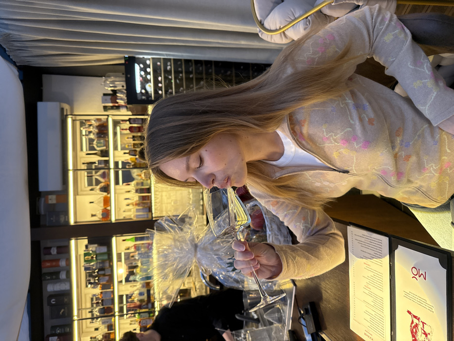 The image captures an indoor scene at the MOMO restaurant/bar, located at Zamkavaya St 1, Hrodna, Belarus. A light-haired female, appearing to be in her twenties, is seated at a dark wooden bar counter in the mid-right portion of the frame. She wears a beige zippered sweater with faint multicolored floral patterns over a white t-shirt. She is in the act of drinking from a stemmed wine glass containing a pale yellow liquid, with her lips pressed to the rim. Her right hand grips the stem of the glass. In the lower-left foreground, an open black menu folder rests on the bar counter, displaying text and a red "MOMO" logo. Behind the woman, the background features a well-stocked bar. Multiple tiered shelves display numerous bottles of various spirits, illuminated by warm LED strip lighting. To the far left, a person, partially visible and wearing a dark top, stands behind the bar. A large gift basket, wrapped in clear cellophane and secured with a bow, is situated on the bar counter, with a woven basket containing fruit (apples, pomegranates) visible beneath it. To the right of the bar shelves, a tall, dark wine cooler/refrigerator is visible, storing multiple bottles on its racks. A white air conditioning unit is mounted on the wall above the bar shelves. Light-colored curtains are present on the far right edge of the frame, adjacent to a padded chair with a golden-colored frame.