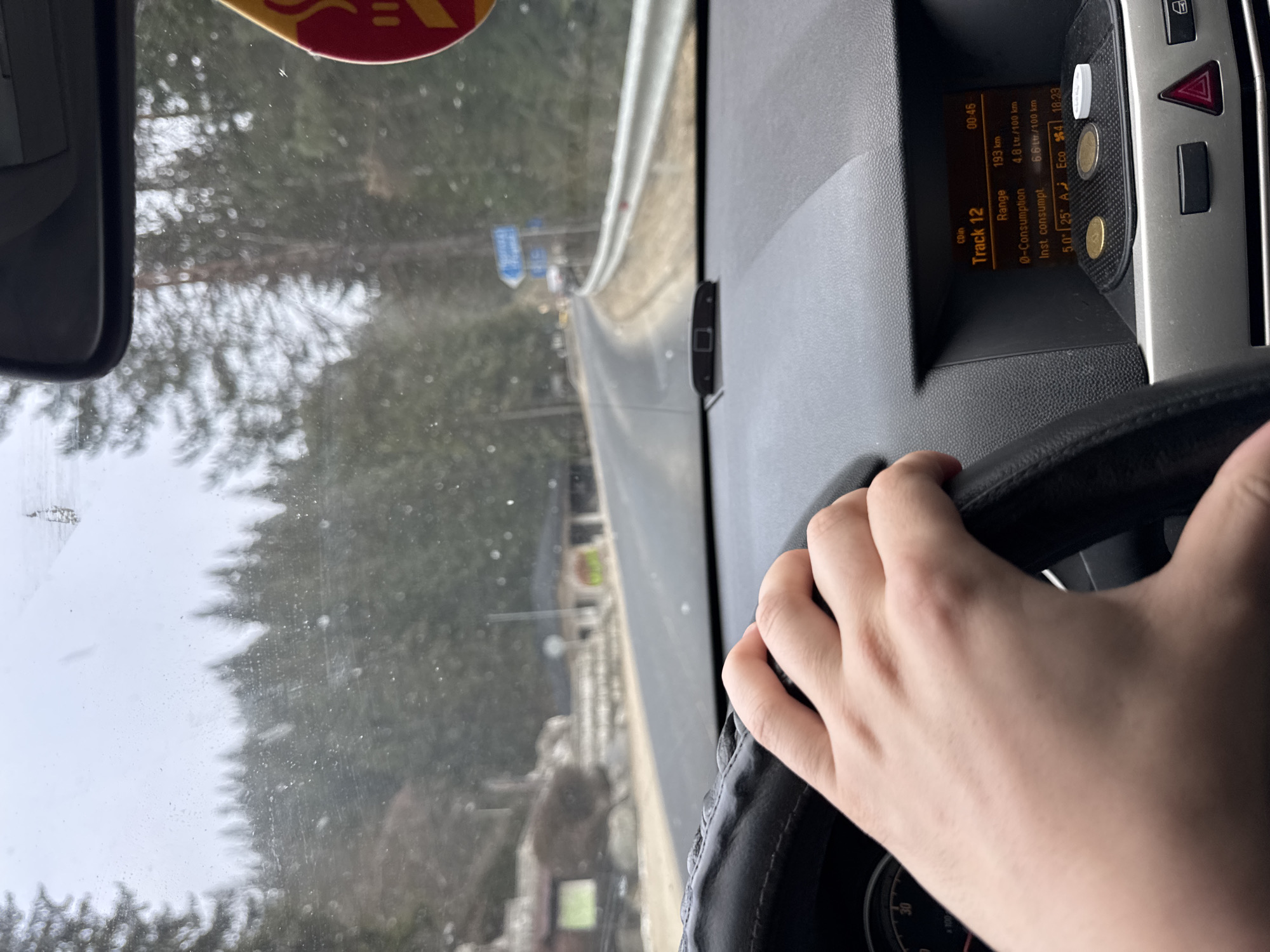 A view from inside a vehicle, focusing on the dashboard and the driver's hand on the steering wheel