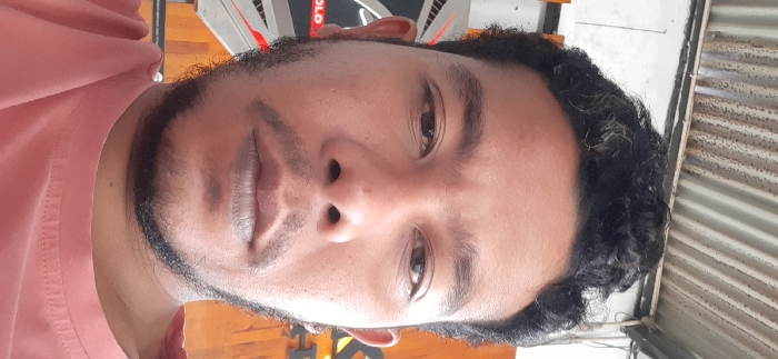 A man with dark, curly hair and a beard poses for a close-up shot. He's wearing a peach-colored shirt. His eyes are open and he's looking at the camera. The background includes wooden surfaces and a metal structure with visible panels. He appears to be indoors.