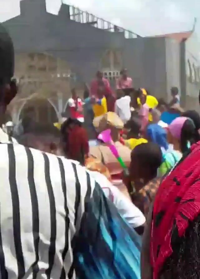 The video depicts a bustling outdoor gathering in front of a church. A crowd of people, some wearing brightly colored clothing, fill the space between the viewer and the building. It appears that there is a live performance or celebration, as a person in the center of the crowd seems to be leading the festivities, possibly speaking into a microphone. The church, with its cross atop, serves as a backdrop to the event. The sky is overcast, suggesting that the weather is mild. The video captures a vibrant and lively scene, seemingly full of energy and community spirit.