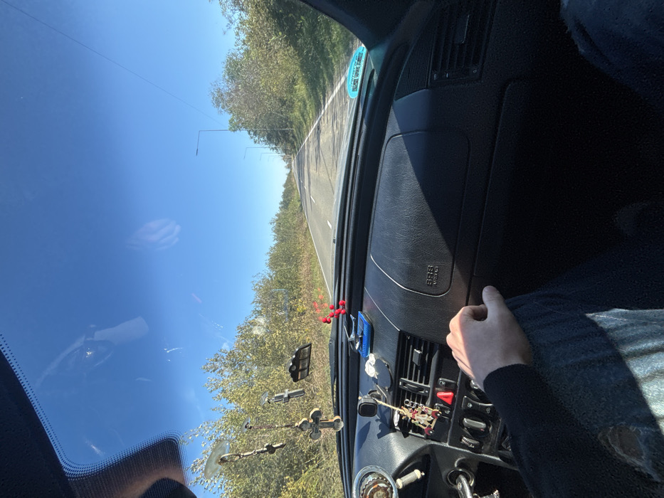 A view from inside a car, angled slightly upward. The road stretches ahead, flanked by trees under a clear blue sky. The dashboard is visible, featuring vents, controls, and an "SRS" label. Hanging ornaments dangle from the rearview mirror. A person's hand rests on the passenger side dashboard, wearing a dark sweater. The sun shines brightly, reflecting off the windshield.