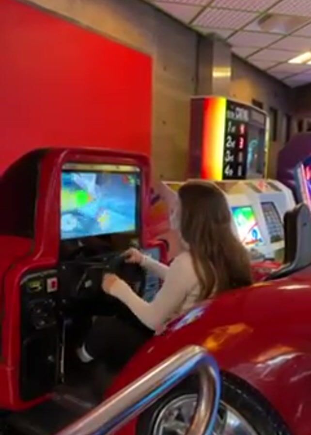 A young woman with long brown hair plays a racing game in an arcade. She's seated in a red racing car-style arcade machine, gripping the steering wheel and focused on the screen. The game displays a cartoonish winter racing environment. The arcade is brightly lit, with other arcade machines visible in the background.