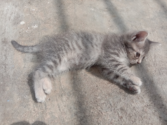 - "A single gray tabby kitten is observed lying on its left side on a concrete surface in Ciherang, Indonesia" by FM-TaKCH3, licensed under CC BY 4.0
