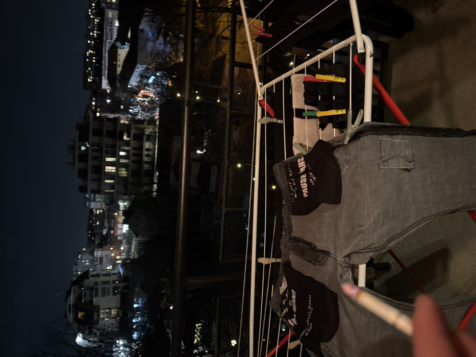 The image captures a nighttime perspective from a balcony in Sofia, Bulgaria. In the immediate foreground, an out-of-focus human hand in the lower-left holds a lit cigarette, exhibiting a glowing ember and accumulated ash. A white, multi-tiered metal laundry drying rack occupies the central foreground, supporting various garments. A pair of faded grey jeans with black side stripes and pockets, one visibly marked "PAUSE JEANS," is draped across the front of the rack, secured by diverse colored clothespins. Behind the laundry rack, a dark metal balcony railing spans the width of the frame. Beyond the railing, a dense urban cityscape unfolds under a dark night sky. Numerous multi-story buildings are visible, characterized by illuminated windows, including one distinct heart-shaped light in an upper window of a building on the right. Distant streetlights and building lights provide scattered illumination across the predominantly dark environment, where bare trees are interspersed among the structures.