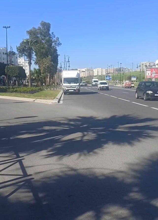 street scene during the day. The sky is clear and blue. There are several vehicles on the road, including cars, a bus, and vans. A large building, possibly a stadium, is visible in the background. A billboard stands tall near the stadium. A person is walking along the side of the road. The camera seems to be filming from a sidewalk, with the shadows of trees or structures visible on the ground.