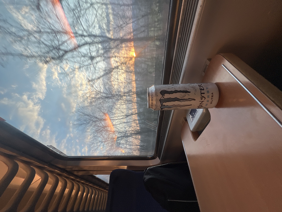 The image displays the interior of a train car, reportedly in Djerman, Bulgaria, observing an exterior landscape at sunset. A light-brown, pull-down tray table occupies the foreground. On the right side of this table, an upright white Monster Energy Ultra can, exhibiting condensation, is centrally positioned. To its left, a small, light-colored dispenser-like object is partially recessed into the table. A dark blue fabric train seat is visible on the left side of the frame, adjacent to the table. Above the window, the train's interior ceiling features light-colored, ribbed panels. Through the train window, a sunset scene unfolds with a bright orange sun visible near the horizon. The sky transitions from light blue with scattered clouds to vibrant orange and yellow where the sun is setting. Numerous bare deciduous trees with dark branches are silhouetted against the sky and distant, dark landforms. The external elements exhibit motion blur, indicative of a moving train. No individuals are present in the depicted scene.