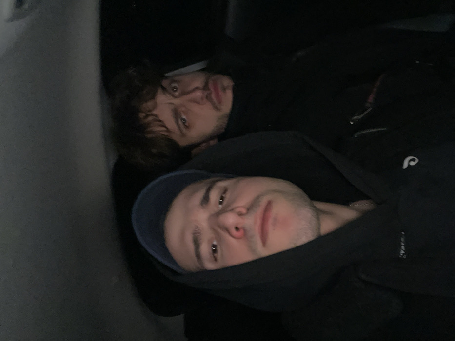 Two men are pictured in a dimly lit, close-up shot. One man, wearing a dark beanie and a hooded sweatshirt, is positioned in the foreground, his face oriented towards the camera. Behind him, the second man looks upward with slightly widened eyes and a neutral expression. Both men appear to be in casual clothing, primarily black. The lighting and angle of the photo create an intimate, almost claustrophobic feeling.