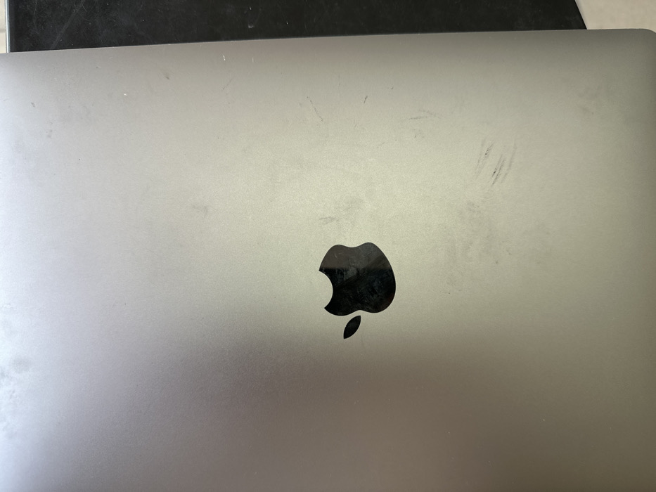 This image captures a close-up, overhead view of the silver-colored, closed lid of an Apple MacBook laptop, situated in Mexico City, Mexico. The laptop lid features a prominent black Apple logo centrally positioned. The metallic surface exhibits numerous smudges, fingerprints, and fine scratches, indicative of regular handling and wear. A series of distinct, dark, streaky marks are visible in the lower right quadrant of the lid. No individuals are present in the frame, and no specific actions or interactions are depicted. A dark, out-of-focus surface is partially visible along the right edge of the laptop, against which the device rests. The lighting is diffused, illuminating the surface imperfections.