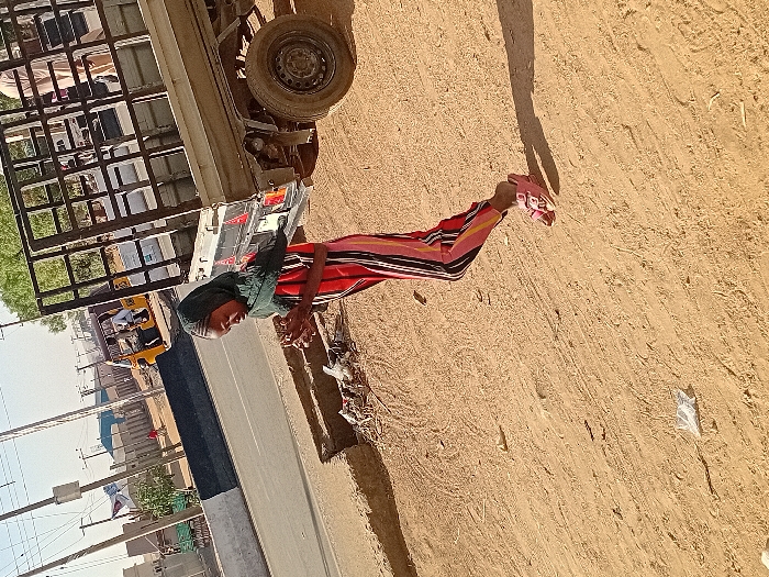 The image depicts an outdoor scene in Gandu Albasa, Nigeria, under bright daylight. The foreground features a young female, estimated to be a child, standing on a reddish-brown dirt and sand surface. She is positioned slightly to the right of the frame's center, facing generally left and downwards. She wears a dark-colored hijab, a vertically striped long-sleeved garment in shades of red, pink, and possibly brown, and pink open-toe sandals. Her hands are held up near her chest, fingers appearing intertwined or holding a small, indistinct object, and her gaze is directed towards her hands. To her immediate right, a portion of a utility truck is visible. This truck is light-colored with a dark, open, cage-like cargo bed constructed from metal bars. A single rear wheel of the truck is prominent. At least one individual in light-colored attire is standing within the truck's cargo bed. Behind the girl and the truck, a paved road is visible, separated from the dirt shoulder by a black and white concrete median barrier. On the road, further in the mid-background, a yellow motorized tricycle (known as Keke Napep) with at least two occupants can be seen. The background features several utility poles with overhead wires crisscrossing the sky. Distant low-rise buildings and sparse vegetation are also present under a clear sky. Scattered refuse, including plastic bags, is visible on the dirt ground near the roadside.