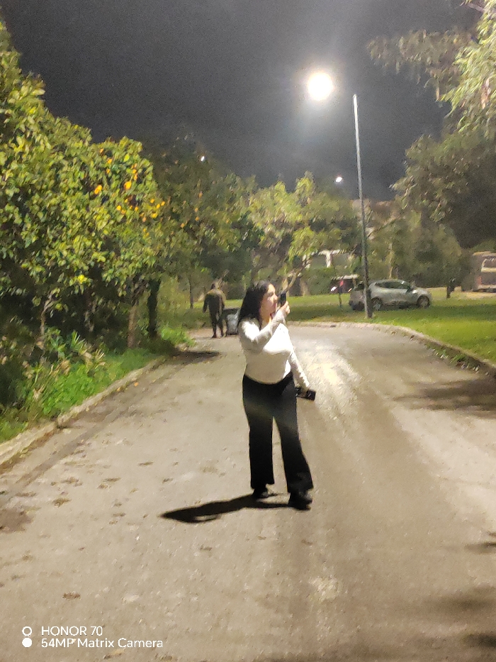At night, a woman stands on a paved path, holding what appears to be a phone or camera. She's dressed in a white top and dark pants. Behind her, a man walks away, and further back, cars are parked near a grassy area. Trees line the path, some laden with fruit. A streetlight illuminates the scene. The image has an HONOR 70 watermark in the corner.