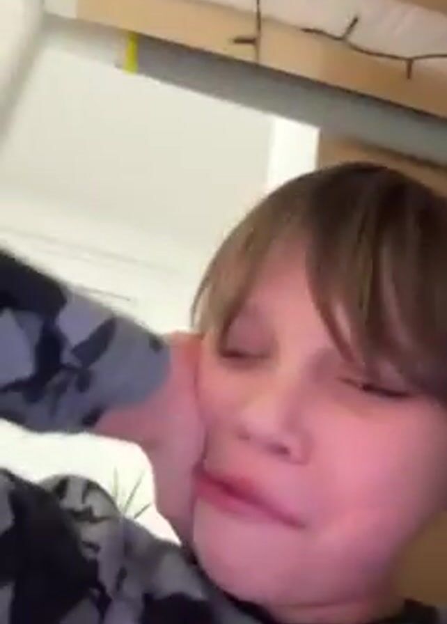 A young boy with brown hair is lying down, resting his face on his hand. He looks like he is in pain and says "Oh, you're making it hurt." He briefly raises his other hand to his head. The background shows the underside of a bed frame with some lights attached to it, and a wooden door.