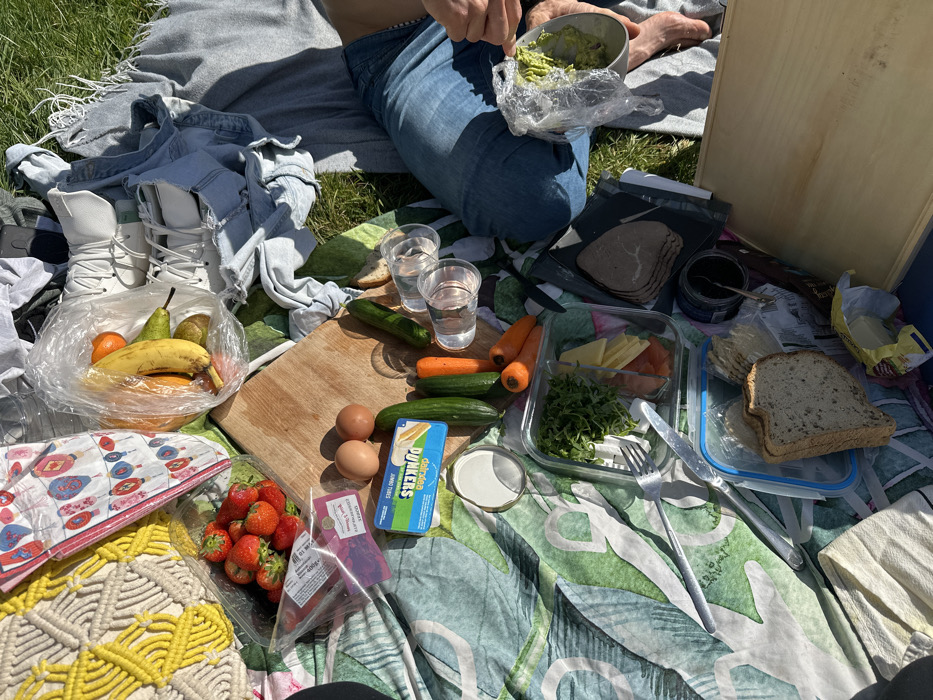A picnic is taking place in Sefton Park, Liverpool, United Kingdom, at a latitude of 53.376 and a longitude of -2.937. A picnic blanket is spread out on the grass, and a variety of food and drink items are laid out. The items include strawberries, eggs, sliced bread, cucumbers, carrots, a spreadable cheese, salad, smoked salmon, meat slices, and two glasses of liquid. A person is sitting on the blanket and is eating from a bowl. A pair of white ice skates lie on the blanket. A wooden cutting board is positioned on top of the blanket. A couple of cloth items are visible in the background, as well as a piece of wooden furniture. A plastic bag full of fruit is also lying on the blanket. The sun is shining and the grass is green.