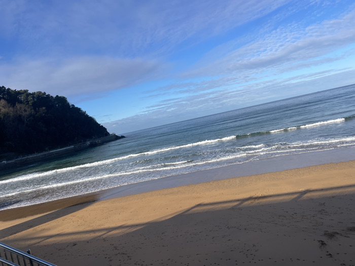The image captures a coastal scene in Zarautz, Spain, from an elevated vantage point. The foreground features a wide expanse of light brown sand, stretching from the bottom of the frame towards the ocean. Distinct, elongated shadows from an unseen structure in the immediate foreground are cast diagonally across the sand, extending from the lower right to the mid-left. Faint footprints are discernible on the sand. The midground is dominated by the Atlantic Ocean, exhibiting varying shades of blue and green. Several lines of white-capped waves are actively breaking onto the shore. To the left, a dark, densely tree-covered headland or hill extends into the water, forming a natural barrier. A light-colored structure, possibly a walkway or sea wall, is visible at the base of this landmass where it meets the water. The sky above is clear and bright blue, interspersed with wispy white clouds. A metallic railing, likely part of a staircase or viewing platform, is partially visible in the bottom-left corner of the frame. No individuals, animals, or explicit human activities are present within the scene.