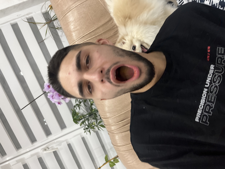 An indoor scene within the city of Reselets, Bulgaria, depicts a young adult male with dark hair, a beard, and a mustache, positioned prominently in the foreground. He is looking directly at the camera with his mouth wide open in what appears to be a yawn or exclamation. He wears a black long-sleeved shirt featuring white text that reads "PRECISION UNDER PRESSURE" and "6N/SE". To the right and slightly behind the male subject, a small, fluffy, light-colored dog, possibly a Pomeranian, is visible with its mouth slightly open, tongue exposed. The background includes a light brown, possibly upholstered, curved furniture piece, consistent with a couch or armchair. Behind the furniture, a large window is covered by white horizontal slatted blinds. Several green plants are present, one with prominent purple orchid flowers (Phalaenopsis) positioned behind the man's head, and another with smaller, darker green leaves to his left. A dark and light patterned textile or surface is partially visible in the bottom right corner.