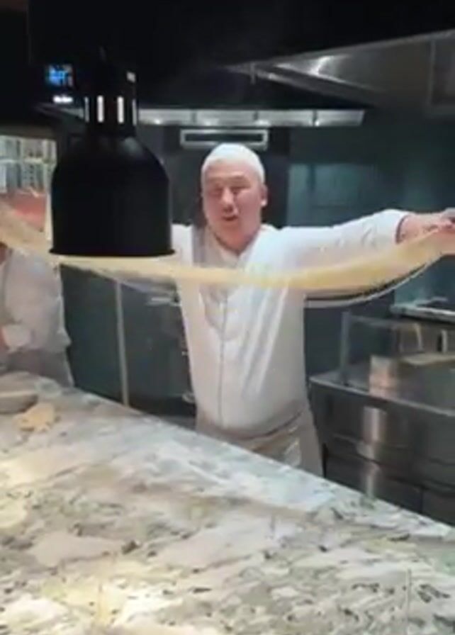 A male chef wearing a white uniform and cap is demonstrating the art of making long noodles in what appears to be a restaurant kitchen