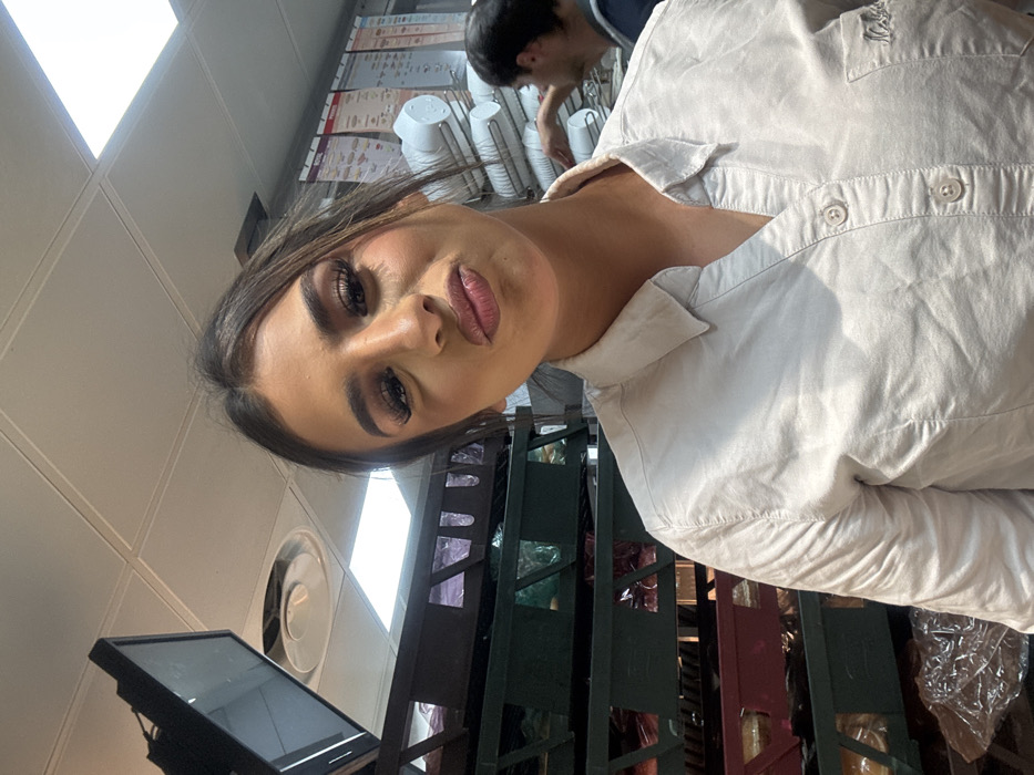 The image depicts the interior of a commercial food service establishment, likely a fast-food restaurant, located in Erstein, France. In the foreground, a female individual, approximately mid-20s, with dark hair pulled back and prominent eye makeup, faces the camera with her lips pursed in a "duck face" expression. She wears a light-colored, long-sleeved collared shirt with an embroidered emblem on the left chest pocket. The background to the left features a multi-tiered, dark-colored shelving unit containing various items in clear plastic bags within green and dark red bins. Above this shelving, a dark flat-screen monitor is mounted. The ceiling is a white dropped panel design with rectangular fluorescent lights and a circular ventilation grate. To the right, a male individual is partially visible from the back and right side, wearing a dark shirt, and appears to be reaching towards a vertical dispenser holding stacked white cups or containers. Further right on the wall, posters or menu boards are visible, one of which displays the word "Royal."