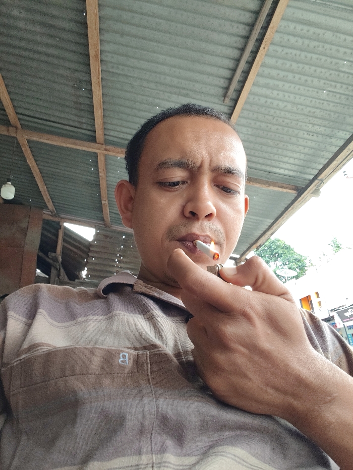 A male individual is depicted in a close-up, chest-up shot, appearing to be in Jurong Pante, Indonesia. He is actively lighting a white filter cigarette held in his mouth, using a silver-toned lighter held in his right hand. A visible flame emanates from the lighter, making contact with the cigarette tip. The man has short, dark hair and a furrowed brow, looking downwards towards the cigarette. He is wearing a collared, horizontally striped shirt in shades of brown and beige, featuring a small, stylized 'B' emblem on the left chest area. The overhead environment consists of a corrugated metal roof supported by wooden beams, with a hanging light bulb visible to the left. The background reveals an outdoor setting with green foliage, a white satellite dish, and indistinct urban structures.