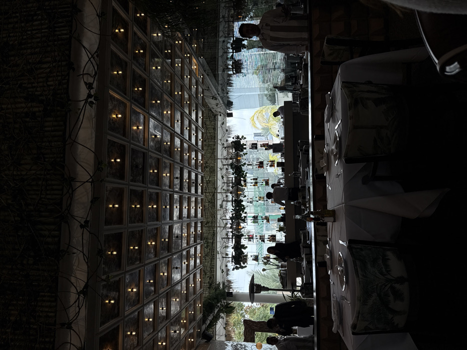The photograph showcases an interior space, possibly a restaurant. A wall featuring an array of small, evenly spaced lights creates a captivating visual effect. Tables are neatly arranged with white tablecloths, and seating appears to be upholstered with tropical leaf patterns. Staff members can be seen attending to guests. The scene is softly illuminated, casting shadows and highlighting the texture of the wall and the details of the table settings. The photograph has been taken from a lower perspective, making the room look bigger.