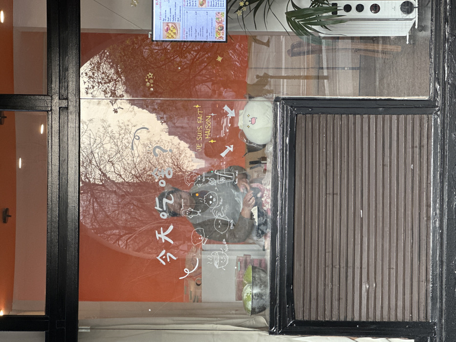 A forensic image of a Parisian storefront window captures an individual preparing food inside while reflecting the urban environment. The window is framed by black mullions. Inside, a person, possibly a woman with dark hair and glasses, wears a light apron over a dark shirt, meticulously working with a white substance on a dark counter. To her left, a metal bowl contains green produce. A light green, cartoon-faced plush dumpling or garlic figure rests on the counter to her right. The interior background is a vibrant orange wall. White text on the glass reads "今天吃啥?" (What to eat today?) in Chinese, and "JE SUIS FAIT MAISON" (I am homemade) in French, surrounded by cartoon depictions of food items like "Noodle," "Mochi," "Bao!", "Wonton," "Tempura," and "Yuu mei!". A digital menu board, predominantly in French, is visible on the far right, displaying dishes and prices. Reflections on the glass include bare tree branches, characteristic Parisian Haussmannian building facades, and faint figures of pedestrians. A white radiator and a potted plant are also reflected on the right side of the window. The lower portion of the window is partially covered by a dark brown, horizontally slatted roll-down shutter.
