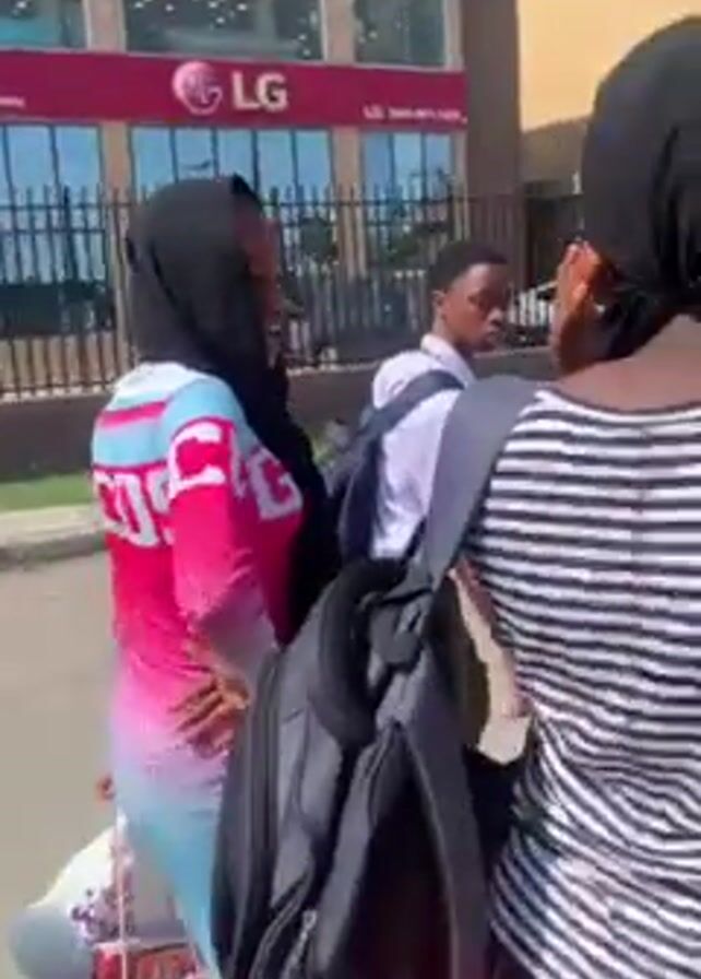 Several people are walking down a sidewalk beside a street. The people include at least one school-aged boy in a white shirt and black tie, a person wearing a black hijab and a long-sleeved shirt, and a woman in a purple shirt. The sidewalk is concrete. Buildings and businesses are in the background. One of the businesses is LG Square.