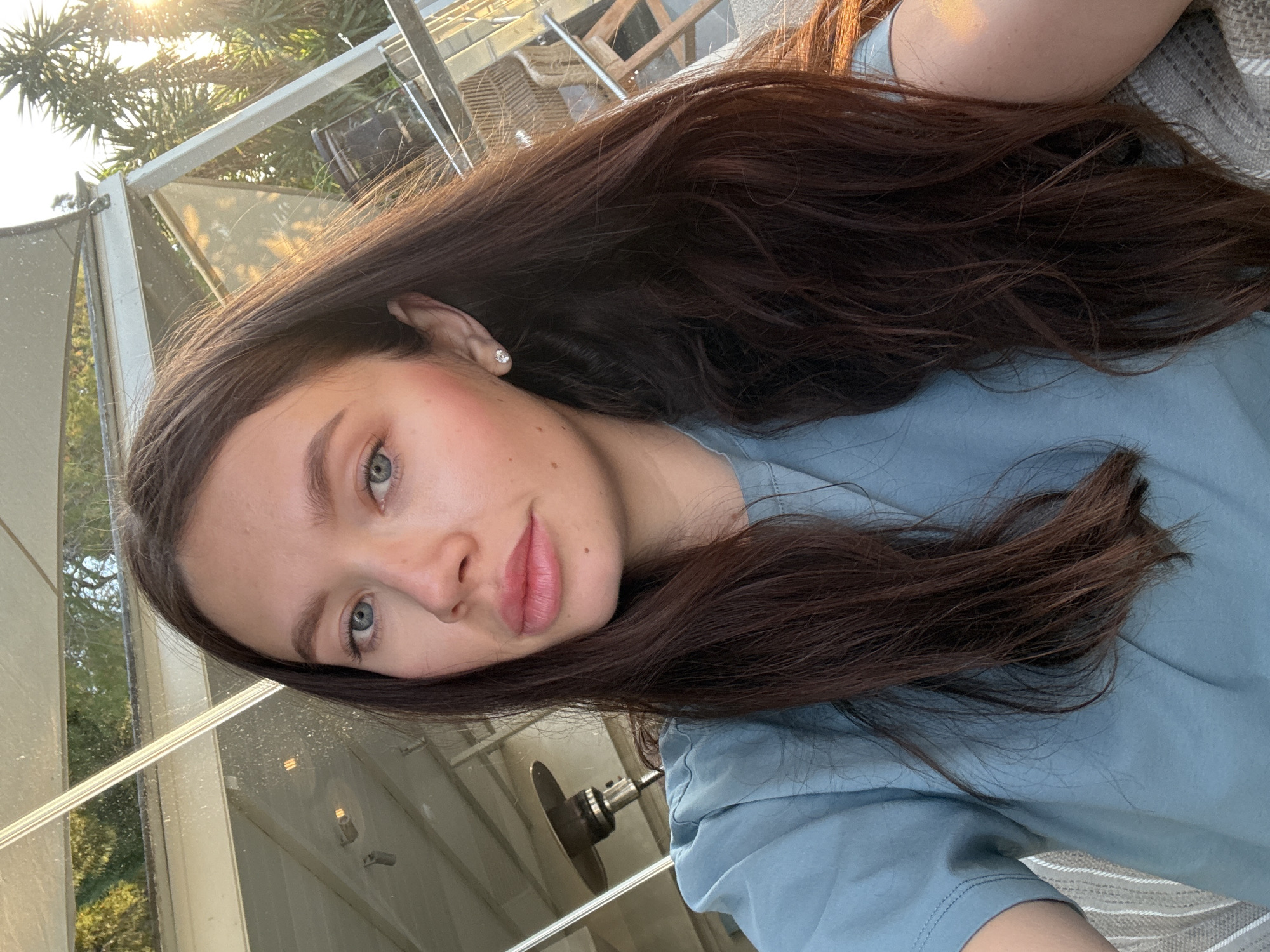 woman with long, dark brown hair wearing a light blue t-shirt. She has fair skin, light blue eyes, and pink blush on her cheeks. The lighting suggests it is daytime. The background features a window and glimpses of greenery and outdoor structures, possibly a greenhouse or outdoor patio. The image appears to be taken outdoors in the Vouliagmeni Municipal Unit, Greece, due to the presence of Mediterranean vegetation and architectural elements consistent with the area. The woman is looking at the camera with a slight smile.