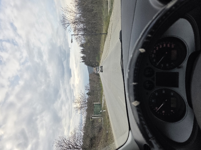 The image presents a forward view from inside a stationary or slow-moving vehicle on an asphalt road in Negorci, North Macedonia. The bottom third of the frame shows the top portion of a dark, worn steering wheel, revealing elements of the dashboard and instrument cluster with two primary circular gauges, both indicating low or zero values. The road, appearing as two lanes without distinct markings, extends centrally into the distance under an overcast sky filled with light grey and white clouds. On the left side of the road, an unpaved shoulder borders a slight incline covered with bare deciduous trees and shrubs. A dark green metal gate is partially visible on the left, set back from the road. Further down on the left, a white rectangular road sign is visible. On the right side of the road, a similar unpaved shoulder adjoins more bare trees and a dark street light pole with an extended fixture. In the mid-distance on the road, a white passenger vehicle is observed, facing the camera's direction, with another, possibly larger, white vehicle visible further behind it. The horizon features distant, tree-covered hills under the cloudy sky.