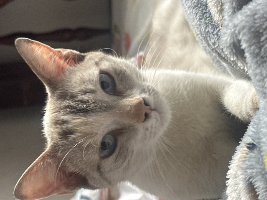 The image presents a domestic cat, situated indoors within a residence in Tinaquillo, Venezuela. The cat, exhibiting light cream to white fur with fawn-colored tabby markings on its forehead and ears, is captured in a close-up, frontal perspective. Its eyes are a distinct blue, and its nose is pink. The animal is lying on a light blue, textured blanket that covers the lower foreground. Its ears are erect, and its gaze is directed straight forward. The background is out of focus, containing indistinct shapes consistent with interior household furnishings, specifically a dark wooden object and lighter, patterned fabric. No human subjects are visible within the frame. The scene is illuminated by soft, diffused light.