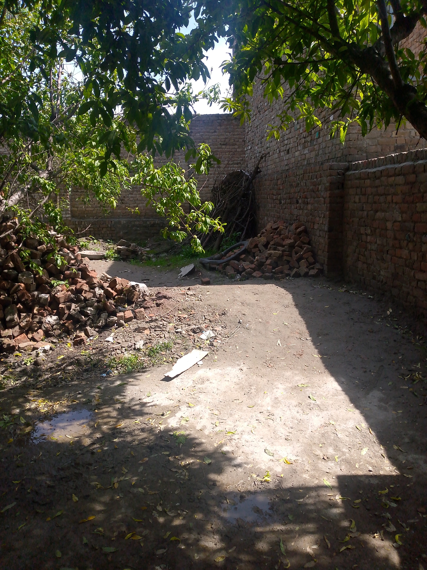 The scene depicts a sunlit courtyard or backyard, located in the city of Unknown, Unknown, filled with debris and under the shade of trees. A brick wall forms the backdrop of the scene. Piles of loose bricks are scattered in the foreground, with a larger pile on the left side. A collection of dead branches and twigs leans against the wall on the right side. The ground is a mix of dirt and mud, with some scattered leaves and a puddle in the lower left corner. There's a long, narrow piece of white material, possibly wood or plastic, lying on the ground. The scene is cast with shadows from the surrounding foliage.