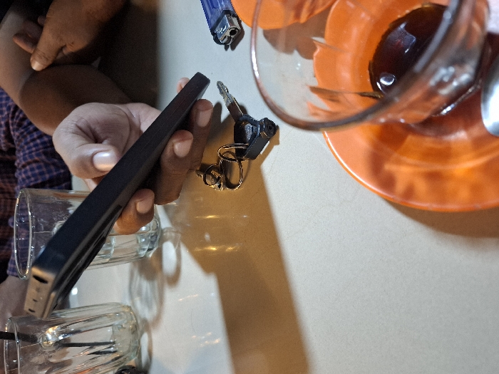 The scene is an interior tabletop view, depicted as taking place in Lhokseumawe, Indonesia. A person's right hand grasps a black smartphone, oriented diagonally across the frame, with its screen facing away from the viewer. To the immediate right of the smartphone, a set of keys, including a vehicle key and a key ring, rests on the light-beige table surface, positioned next to a blue disposable lighter. In the background, two empty clear glass tumblers are visible, one containing a dark stirrer or straw. The lower right foreground features a clear glass mug holding a dark beverage, situated on an orange saucer. A silver spoon is partially visible within the liquid in the mug. A person wearing a blue and white plaid shirt is partially visible behind the smartphone. Another person's forearm rests on the table in the background. Overhead artificial lighting casts a prominent shadow of the phone and hand onto the table surface to the left.