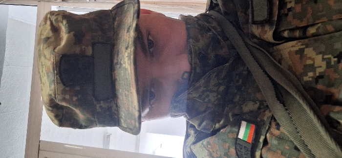 A male individual is depicted in a close-up portrait, oriented forward. His upper face, specifically the eyes and forehead, is visible, while his lower face is obscured by the high collar of his uniform jacket. He wears a digital camouflage pattern uniform, consisting of a patrol cap with a bill and blank hook-and-loop fastener patches, and a jacket. On the upper left sleeve of the jacket, a patch displaying the Bulgarian national flag (horizontal white, green, and red stripes) is visible, with a dark, partially legible text patch above it. A thick, olive-green textile equipment strap crosses diagonally from the upper left to the lower right across his chest. The background is an out-of-focus indoor environment, showing a light-colored ceiling or upper wall, and a vertical white frame consistent with a door or window opening. The illumination is indirect and diffused. Based on the uniform insignia, the scene is located within a facility in Sofia, Bulgaria.