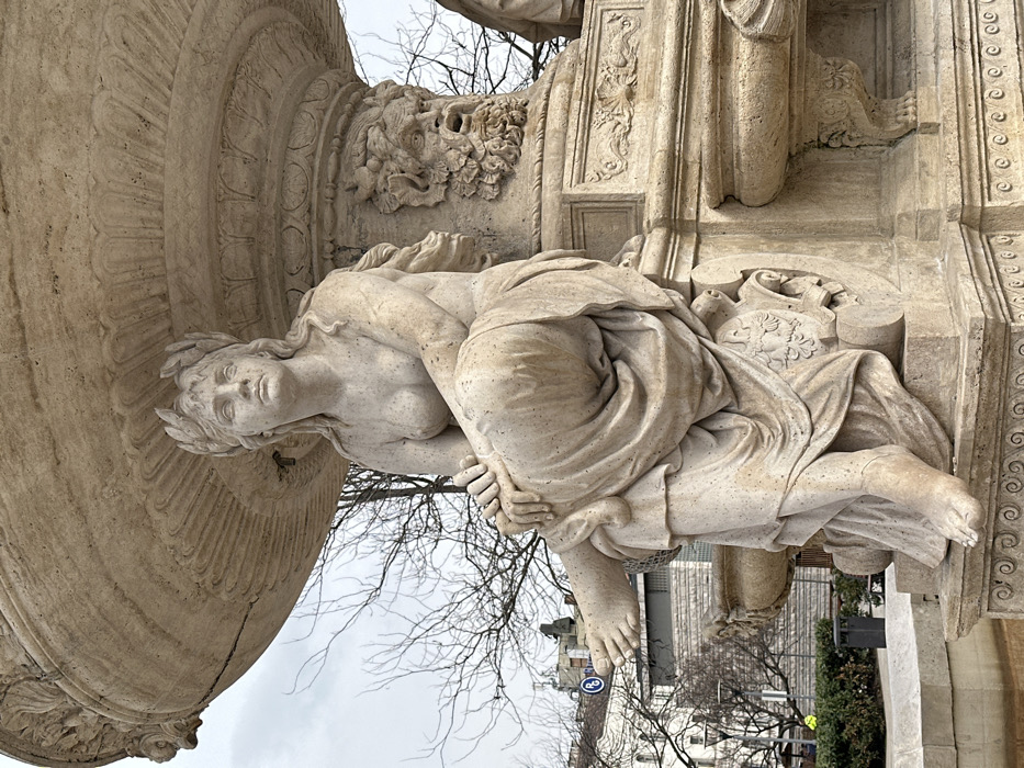 The image depicts a portion of the Danube Fountain (Duna-kút) located in Erzsébet Square (Erzsébet tér), Budapest, Hungary. The central subject is a seated, allegorical female stone statue forming part of the fountain's base. The statue, rendered in light-colored stone with a visible granular texture, depicts a figure with classical features, wearing a laurel wreath and draped in loose fabric from the waist down, exposing her upper torso. Her hands are clasped in her lap, and her bare feet are visible, with her left leg bent and her right extended forward. She gazes slightly upwards and to the left. To the right of the female figure, another sculpted element of the fountain base features a grotesque male head with a beard and open mouth. The upper tier of the fountain is partially visible, showing its curved, textured underside. In the background, deciduous trees with bare branches are visible against an overcast sky, suggesting late autumn or winter. Beyond the trees, indistinct urban buildings are present, one displaying a blue circular sign with a white 'P' (parking symbol). The scene is illuminated by diffuse natural light.