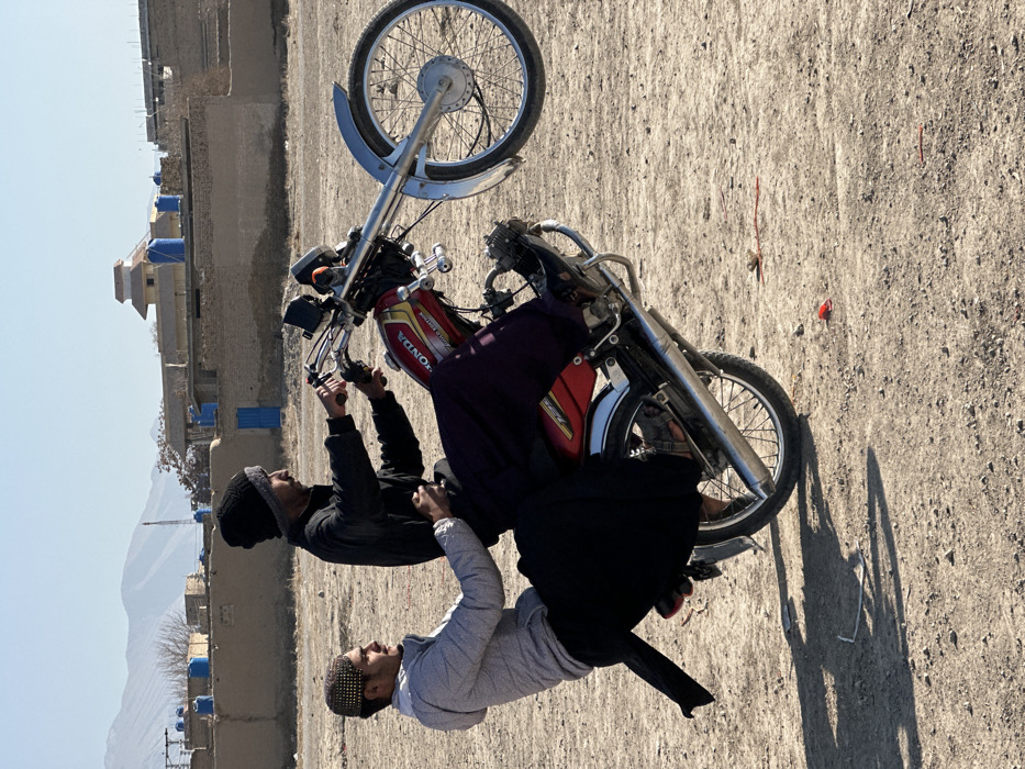 - "two males performing a motorcycle wheelie in an open, dusty area within Quetta City Tehsil, Pakistan" by FM-KEB4x1, licensed under CC BY 4.0