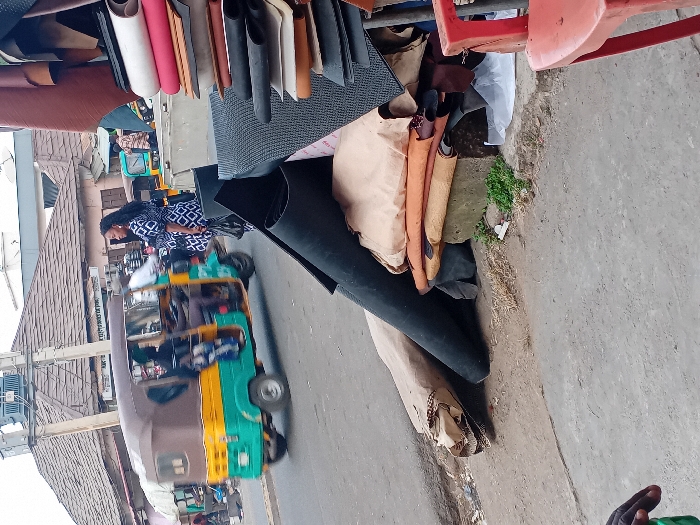 A partially rotated image shows a selection of rolled leather samples in various colors, including red, white, and brown. These are arranged on a display stand on a street. A motorized tricycle passes by in the background, carrying passengers. A woman in a patterned dress stands near the tricycle. Buildings and utility poles are visible along the street. The sidewalk is concrete and contains some debris.