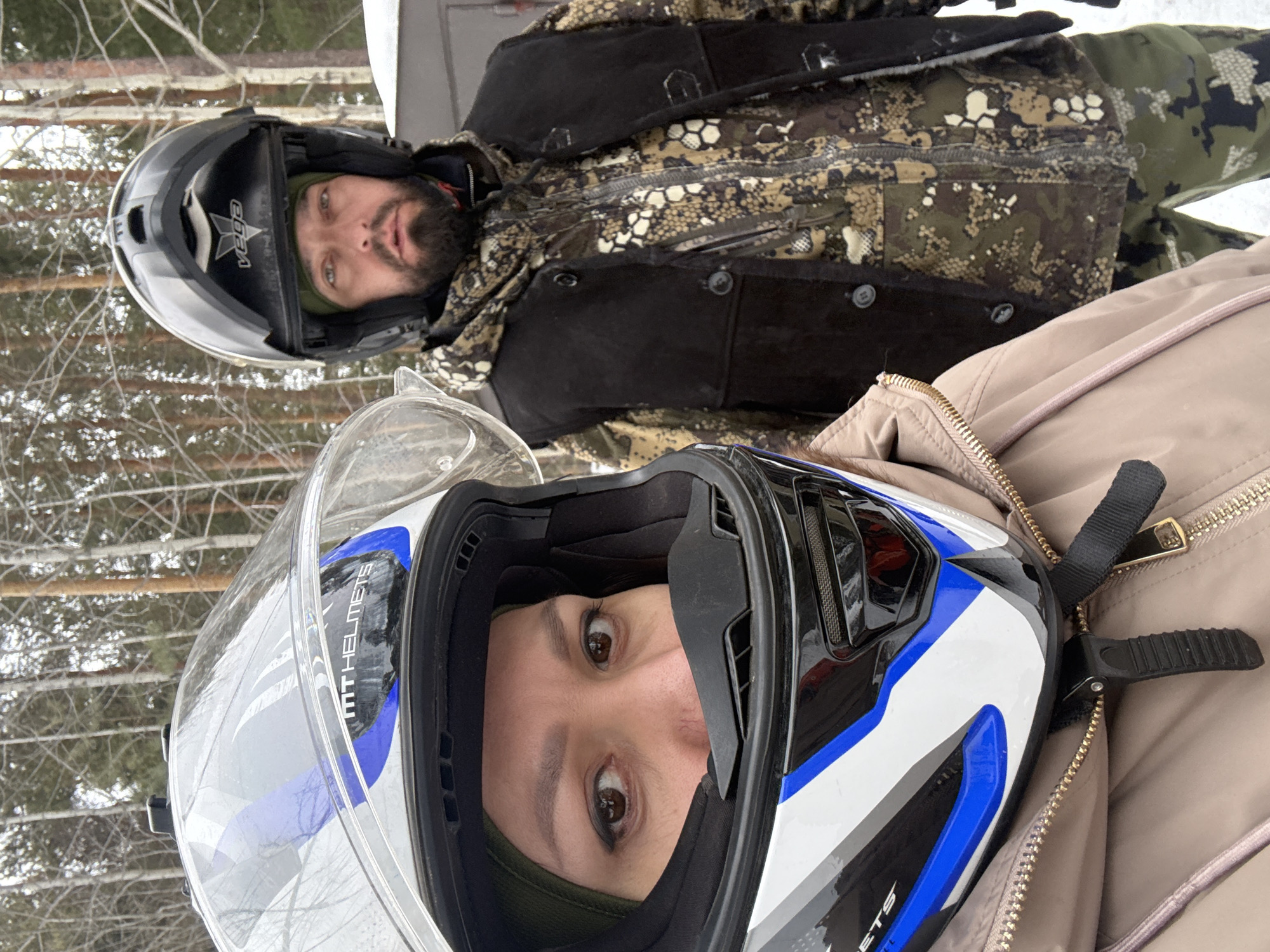 Two people wearing helmets take a selfie outdoors, possibly on snowmobiles