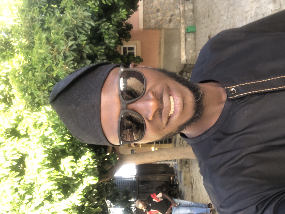 A dark-skinned man smiles at the camera, wearing a black hat and sunglasses. He sports a beard and is dressed in a black shirt with decorative trim. Behind him, lush green foliage fills the frame to the left. In the background, a building with a window and a stone wall is visible. Further below, other people are present in the scene. The lighting appears bright, casting shadows on the foliage and face.