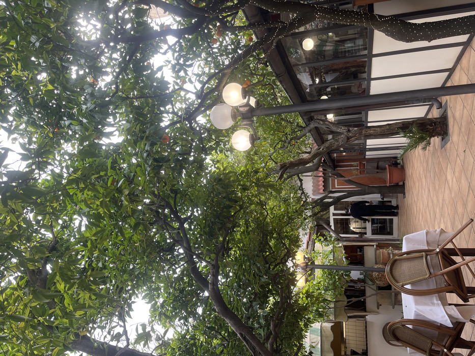 The image captures an outdoor dining courtyard or patio within Sorrento, Italy