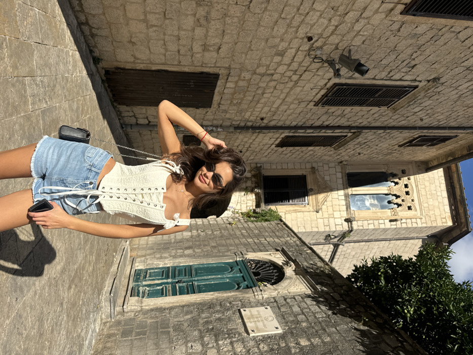 A female subject stands centrally in a narrow stone alleyway in the Old Town of Kotor, Montenegro, specifically at Sveta Ana Street 201, facing the Consular Office of the Republic of Poland. She is positioned towards the viewer, with a slight smile, wearing dark sunglasses. Her right hand is raised, touching her dark, wavy hair. She is dressed in an off-white, textured, lace-up corset-style top with bow-tied straps, and light-wash denim shorts with frayed hems. A small black crossbody bag hangs over her left shoulder, and a black smartphone is held in her left hand. A thin red cord is visible on her right wrist. The alley is paved with uneven cobblestones and flanked by buildings constructed from light-colored, rough-cut stone blocks. On the left, a building wall features two windows with closed dark wooden shutters and a black security camera mounted high on the wall, along with a dark wooden door at ground level. On the right, a building displays a prominent Gothic-style arched window with trefoil tracery on its upper level. Below this, a dark green ornate wooden door with decorative ironwork is visible at street level, next to a white rectangular plaque identifying the "AMBASADA REPUBLIKI POLSKIEJ W PODGORICY" and "BIURO KONSULARNE W KOTORZE, UL. SV. ANNA 201." A portion of a green leafy plant or tree extends into the frame from the upper right, partially shading the stone wall. Direct sunlight from the left casts distinct shadows diagonally across the cobblestone ground. The sky above is blue with scattered clouds.