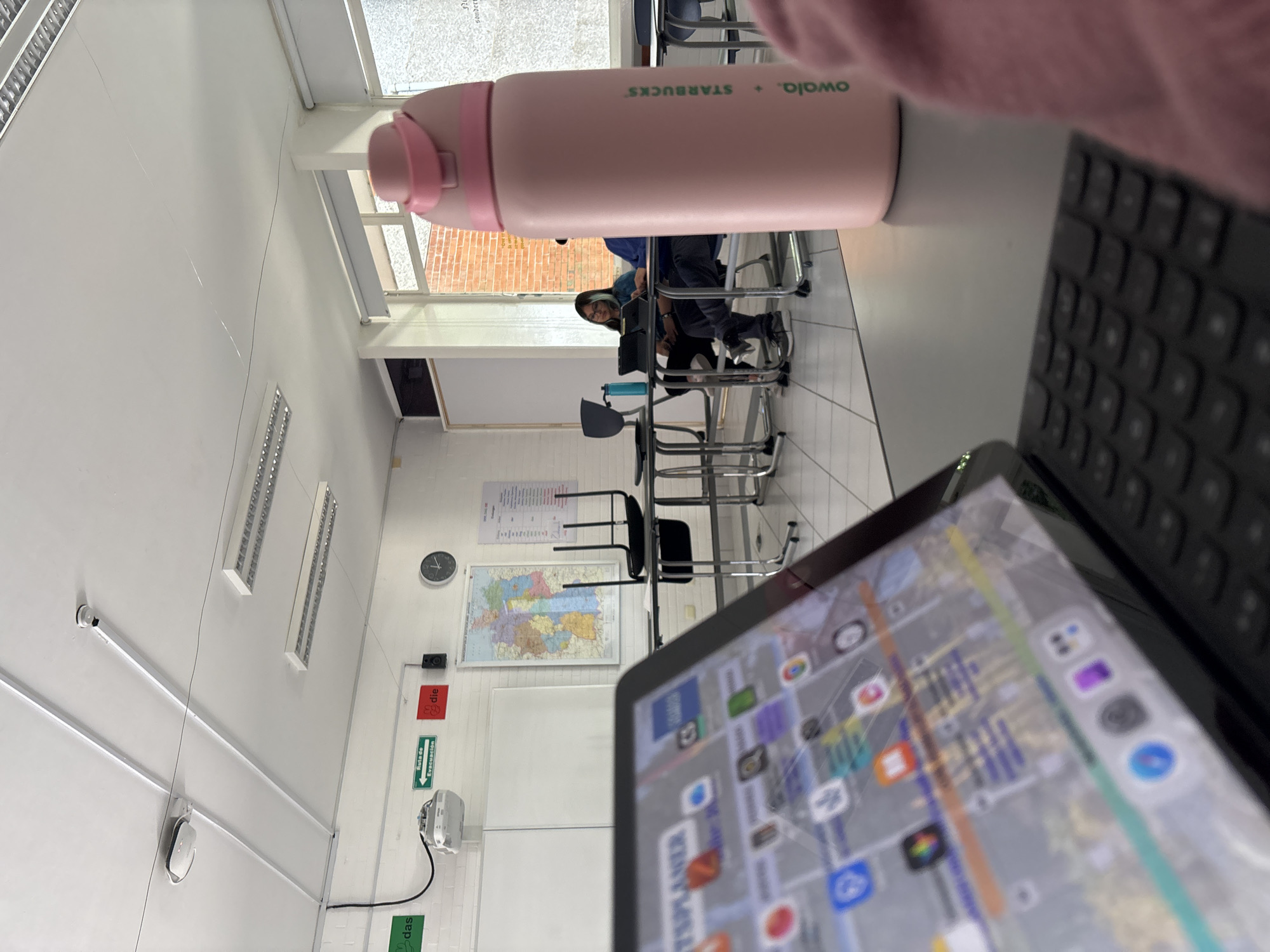 This image depicts an indoor classroom or lecture hall, viewed from a desk in the foreground. In the immediate foreground, a black tablet with an attached keyboard is visible, its screen displaying a grid of application icons, with "TSPLANER" partially visible. To the right, a pink Owala brand water bottle, marked with "Starbucks," rests on the desk. A pink fabric item is partially visible on the far right. The room features white, brick-textured walls, a tiled floor, and a white ceiling equipped with fluorescent strip lighting and a mounted surveillance camera. Wall-mounted items include a white whiteboard system, a green "Ruta de Evacuación" (Evacuation Route) sign, a red sign with "die," a map of Germany, a circular wall clock, and a white projector with a black connecting cable. A small black speaker is also mounted near the red sign. In the midground, several grey desks with metal frames are visible. One desk has two black chairs inverted and placed on its surface. Further back, two individuals are seated at desks near large windows that reveal exterior red brick architecture. One person, wearing glasses and a blue shirt, with dark hair featuring a lighter streak, is observed looking at a tablet on their desk, alongside a blue water bottle. The second individual is partially obscured. This scene is situated within a classroom environment in Puebla, Mexico, as indicated by the "Ruta de Evacuación" sign and explicit location reference. The German map and "die" sign suggest a language education context.