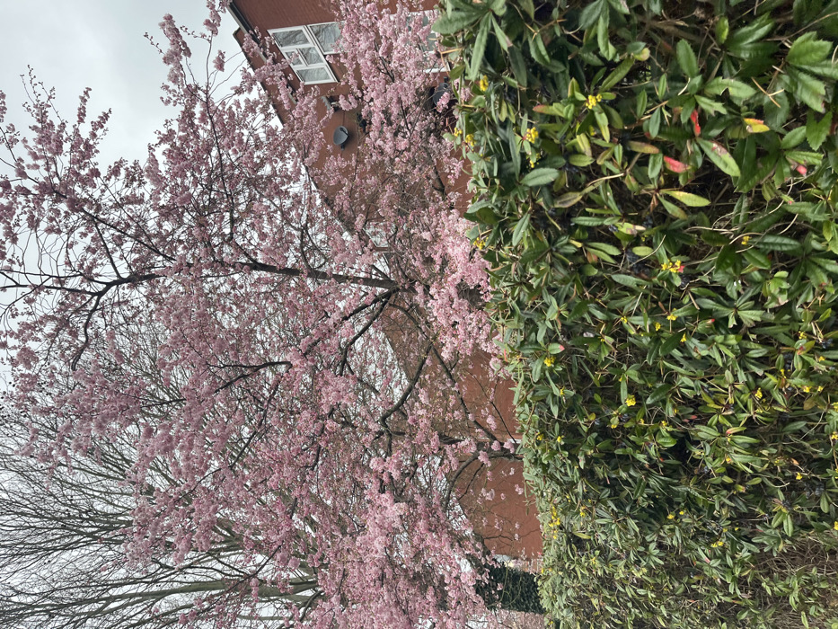 The image depicts an outdoor urban scene in Reading, United Kingdom, characterized by blooming flora under an overcast sky. The foreground is dominated by a dense, green hedge featuring numerous small yellow flowers and scattered dark berries. Above the hedge, a large cherry blossom tree in full bloom occupies the central and upper portions of the frame, its branches heavily laden with pink flowers. Behind the cherry blossom tree, a reddish-brown brick building is visible. This building has white-framed windows, and a dark, circular satellite dish is affixed to its facade. Further to the left, a bare-branched deciduous tree stands against the light grey, cloudy sky. No individuals or specific actions are discernible within the frame.