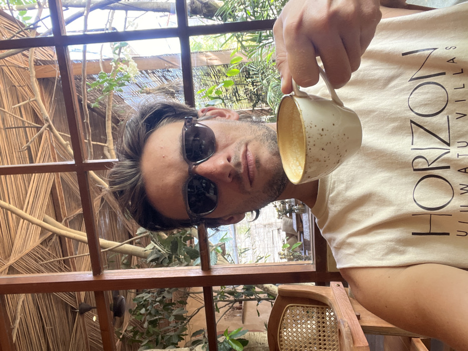 A man wearing sunglasses holds a speckled cup with liquid in it, posing for a photo. He is inside a wooden-framed structure with foliage visible outside. He wears a tan t-shirt with "HORIZON ULUWATU VILLAS" printed in black. Part of a wooden chair is visible at the bottom. The photo is taken from a low angle and rotated slightly counterclockwise.