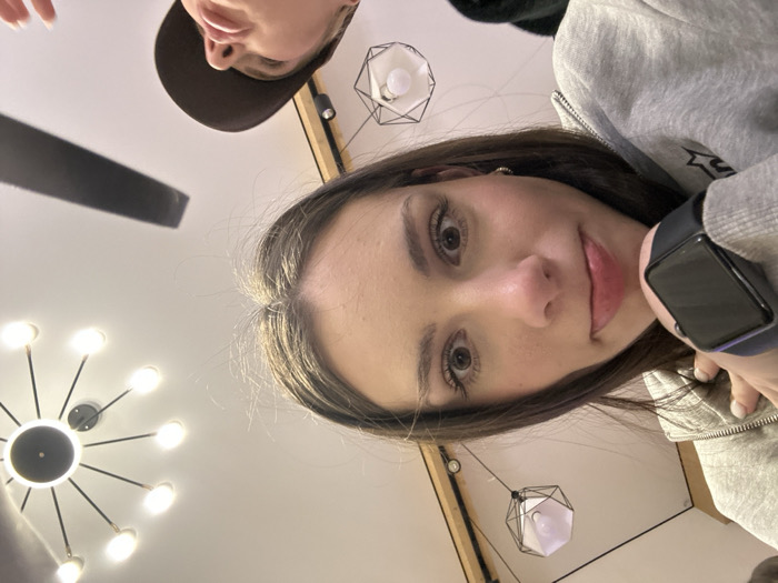 A selfie features two people, one in focus and the other partially visible. The foreground shows a young woman with brown hair, fair skin, and a smartwatch. Her eyes are open, and she is smiling slightly. Behind her is another person wearing a brown hat, cropped at the top of the image. The background includes ceiling lights of two distinct styles, with geometric light fixtures. The perspective is angled upwards, with a ceiling fan blade visible to the left.