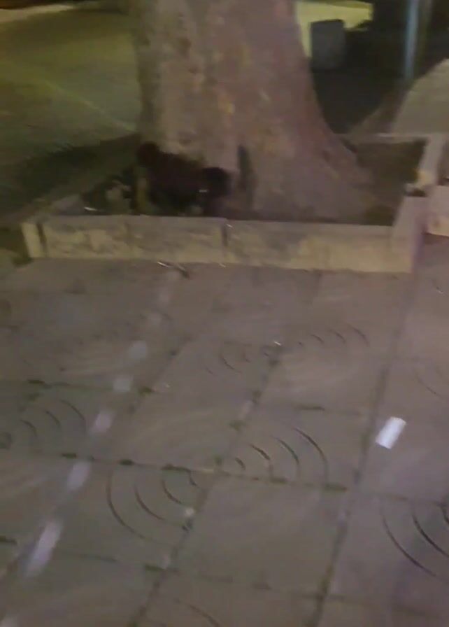 small brown dog standing next to the base of a large tree in a concrete-lined planting area. The dog is urinating, and the stream of urine is visible against the background of gray tiled pavement. The scene appears to be at night or in dim lighting, with street lights visible in the background.