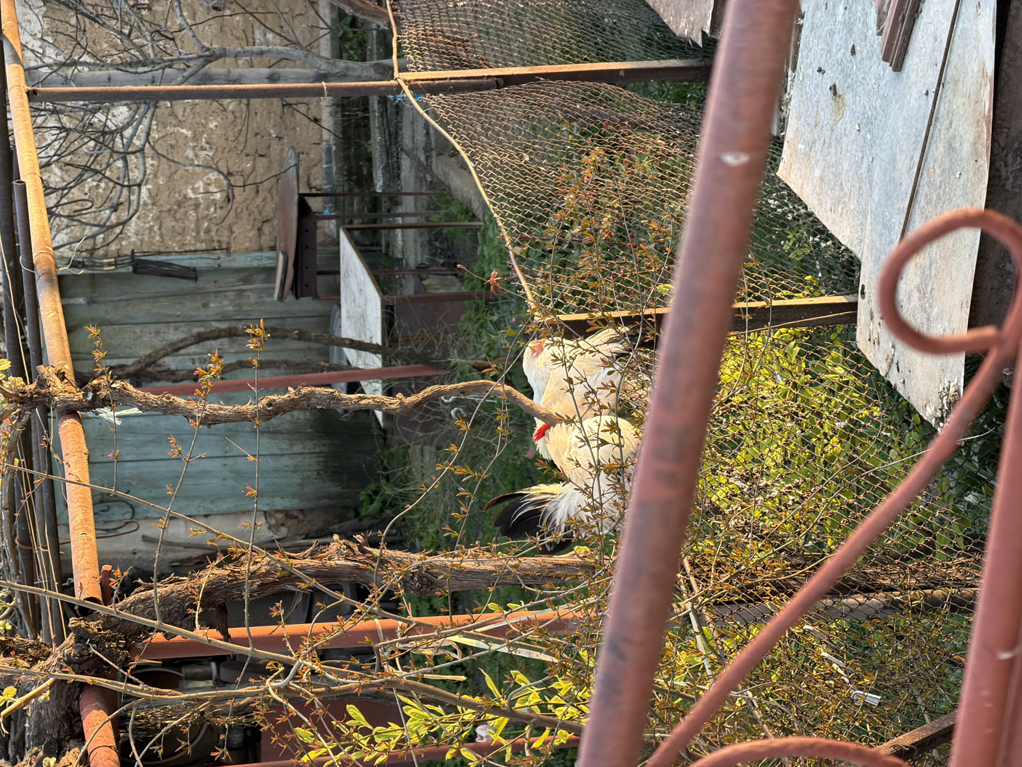 backyard scene, likely taken from an elevated position. Two white chickens with black tails are perched on a branch structure. The background features a mix of wooden and metallic structures, including what appears to be a dilapidated building with wooden planks and a metal fence. The vegetation consists of climbing vines and other plants. The location is specified as Septemvri, Bulgaria.