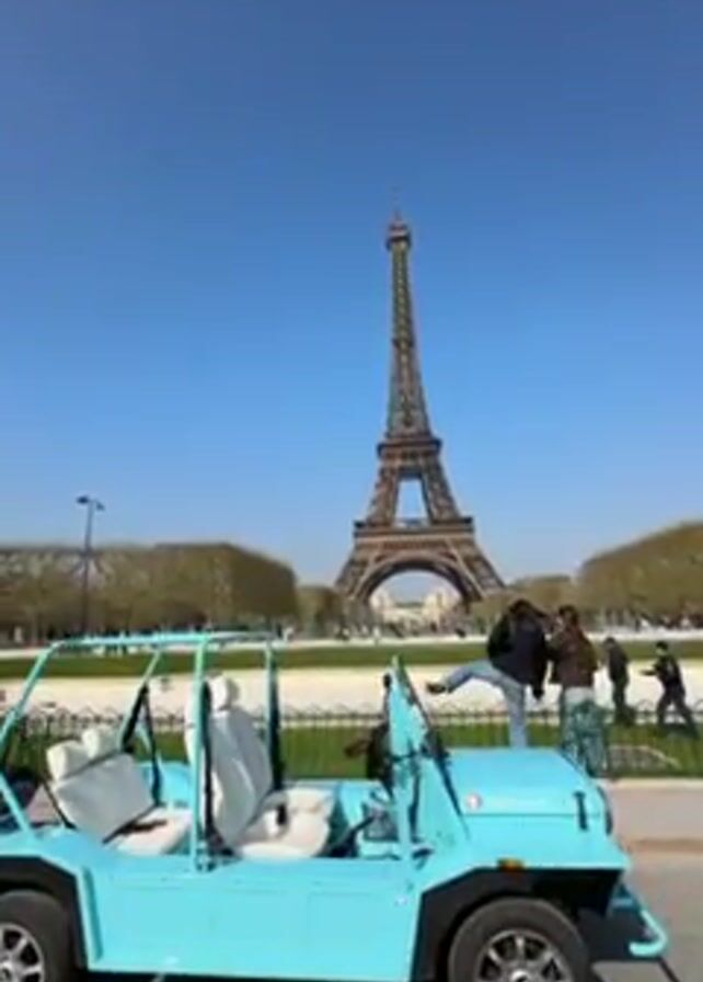 The video presents a scenic view of the Eiffel Tower in Paris, France, on a bright, sunny day. In the foreground, a light blue Moke-style vehicle with white seats is parked. People are strolling and enjoying the view along a pedestrian walkway separated from the road by a short metal fence and a low, green hedge. Two individuals briefly stand on the hedge to pose for a photo with the Eiffel Tower in the background. The tower stands tall against the clear blue sky, surrounded by trees with nascent leaves. The general atmosphere is relaxed and touristy.