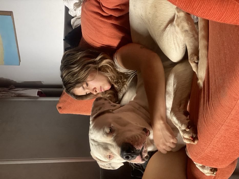 - "A woman with wavy brown hair sleeps on an orange couch, nestled against a large white dog" by FM-hyDqt1, licensed under CC BY 4.0