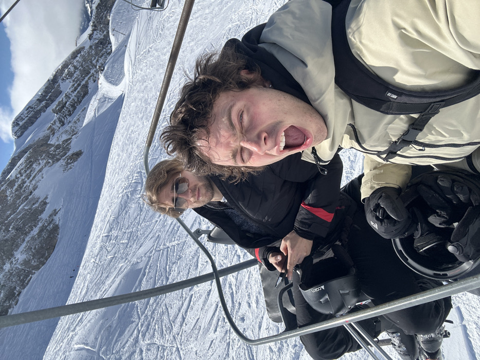 Two males are depicted riding a ski chairlift upwards through a snowy mountain landscape, consistent with a ski resort in La Giettaz, France. The subject in the foreground, a male with curly brown hair, wears a light beige ski jacket and a black backpack. He looks towards the camera with his mouth wide open and eyes squinted, holding a black ski helmet with gloved hands. Behind him, a second male with lighter hair and sunglasses is seated, wearing a dark puffer jacket with red accents. He holds a black smartphone in his right hand and has a black ski helmet resting on his lap. The background features extensive snow-covered ski slopes with visible tracks, leading up to steep, rocky mountain peaks under a partly cloudy sky. Metal elements of the chairlift frame are visible throughout the image.